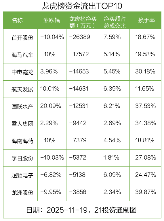而龙虎榜中资金净流出最多的是首开股份(600376.SH),被净卖出为2.64亿元,占总成交金额的7.59%。首开股份收盘下跌10.04%,换手率为18.67%。
