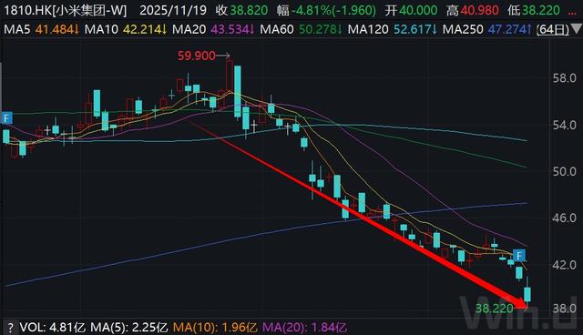 时间放得更长,小米净利润已经连续7个季度环比创下新高。不过,遗憾的是,其财报发布后次日(11月19日),股价低开低走,最低至38.22港元,最终收于38.82港元,大跌近5%。
