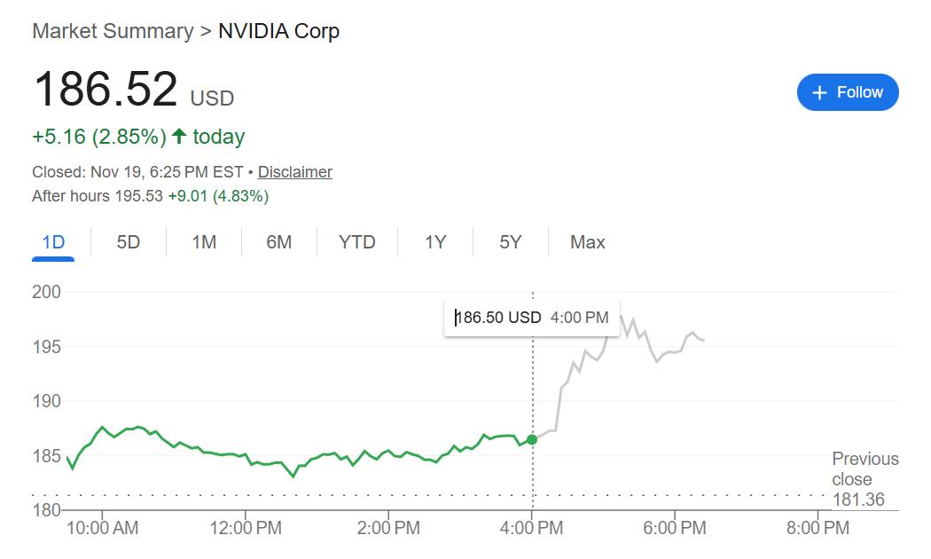英伟达股价盘后上涨超4.8%