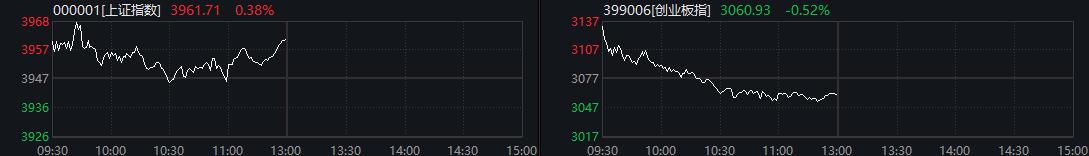 中新经纬11月20日电 20日,A股三大股指高开后走势分化。截至午盘,上证指数涨0.38%报3961.71点,深证成指跌0.05%报13073.30点,创业板指跌0.52%报3060.93点。