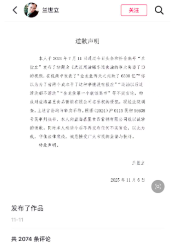 道歉声明显示,2024年7月11日,兰世立通过今日头条及抖音账号“兰世立”发布视频,标题为《武汉用油罐车运食油的事太离谱了!》,并在视频中发表了“金龙鱼两天之内跌了6500亿”“运油以后连清洗都不清洗”“金龙鱼第一个就该退市”等不实言论,构成对益海嘉里名誉权的侵犯。