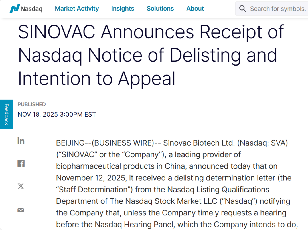 11月19日,科兴生物(Sinovac Biotech Ltd.,纳斯达克股票代码:SVA)发布公告称,公司已于11月12日收到纳斯达克上市资格部门发出的退市决定函。核心原因是公司未能在延期截止日(2025年11月11日)前提交2024年年度报告。根据函件内容,若未及时向纳斯达克听证委员会申请听证,其证券将于11月21日开盘时被暂停交易并摘牌。