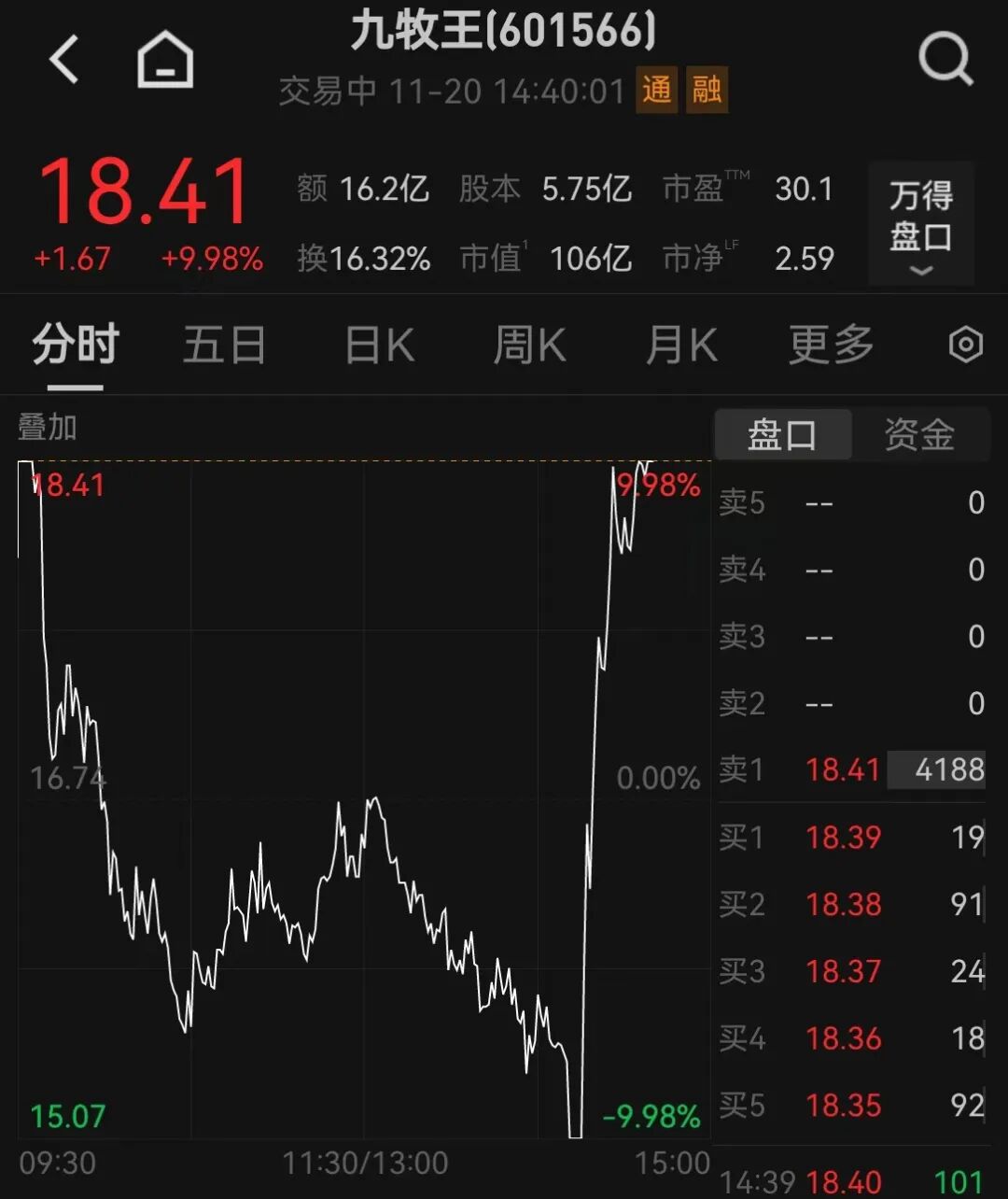 11月20日,九牧王股价高开后直线拉升涨停,盘中炸板,随后股价一路走低,午后盘中触及跌停;随后该股再度直线拉升,触及涨停,上演“天地天”行情。