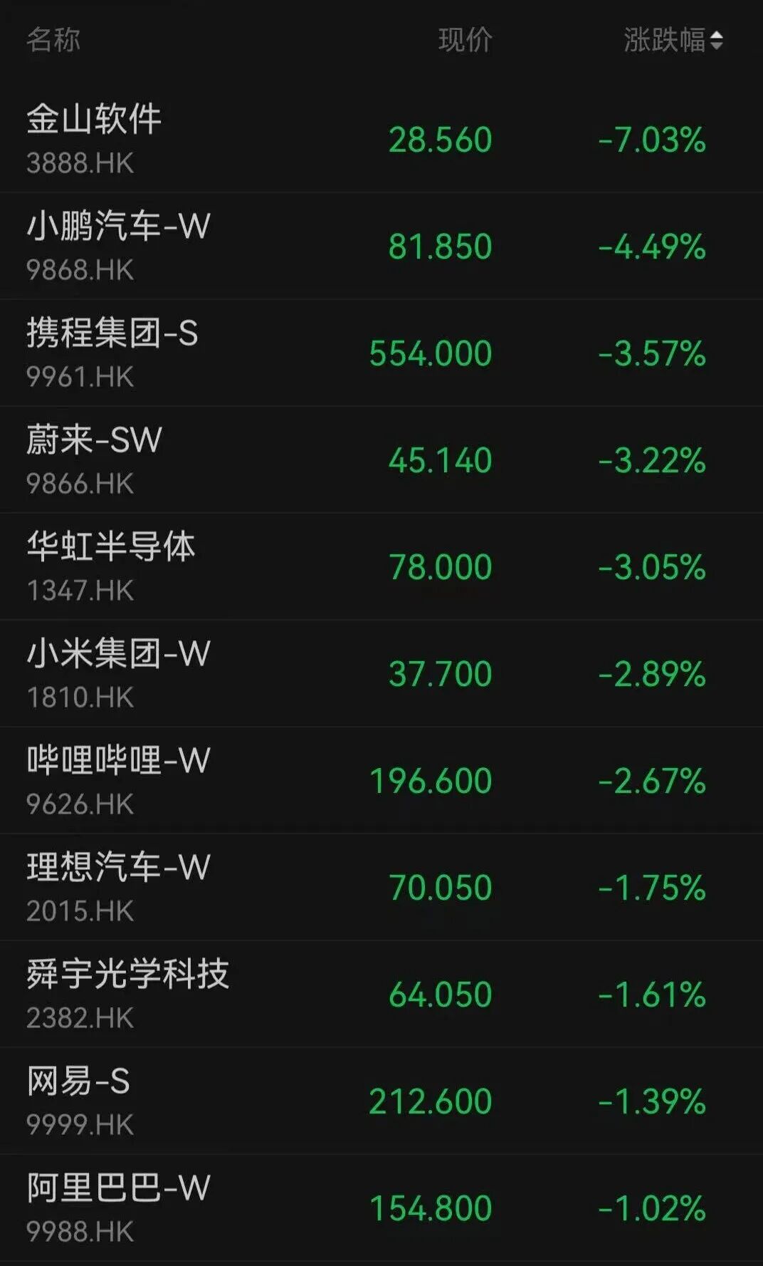 科网股多数下跌,金山软件跌逾7%,小鹏汽车跌逾4%,华虹半导体、蔚来、携程集团跌逾3%,小米集团、哔哩哔哩、阿里巴巴均走低。