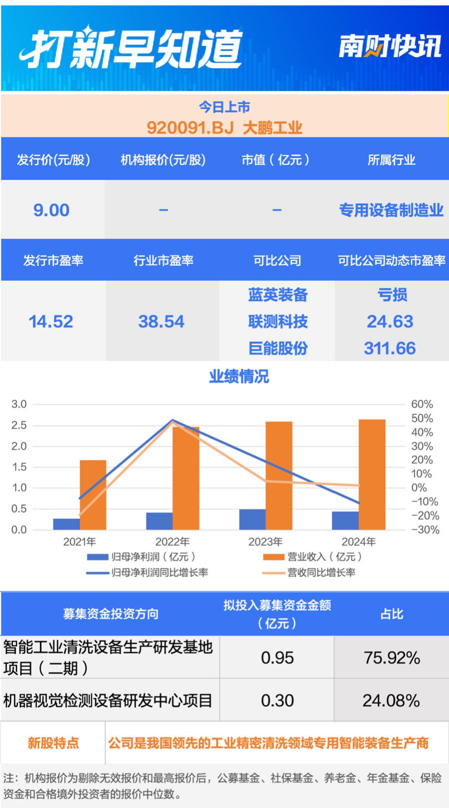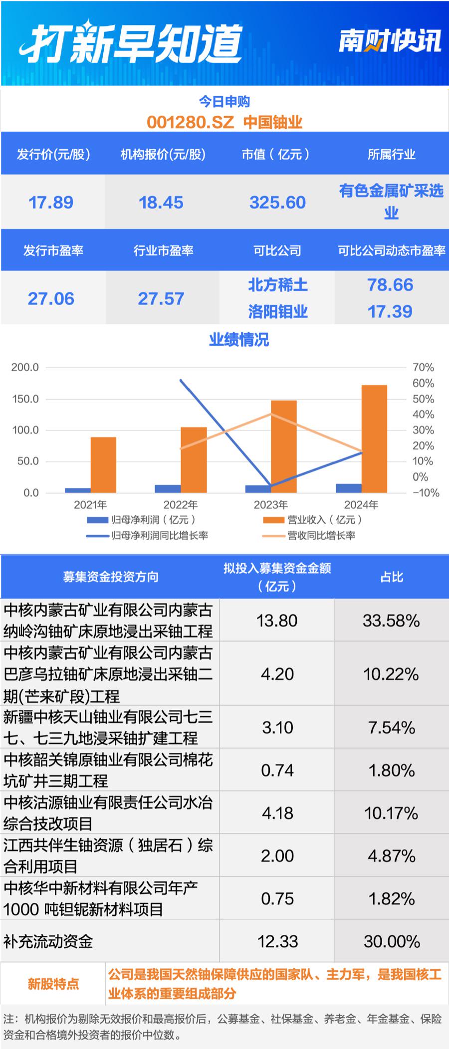 11月21日,可申购深市主板的中国铀业(001280.SZ),另有一只新股上市,为北交所的大鹏工业(920091.BJ)。
