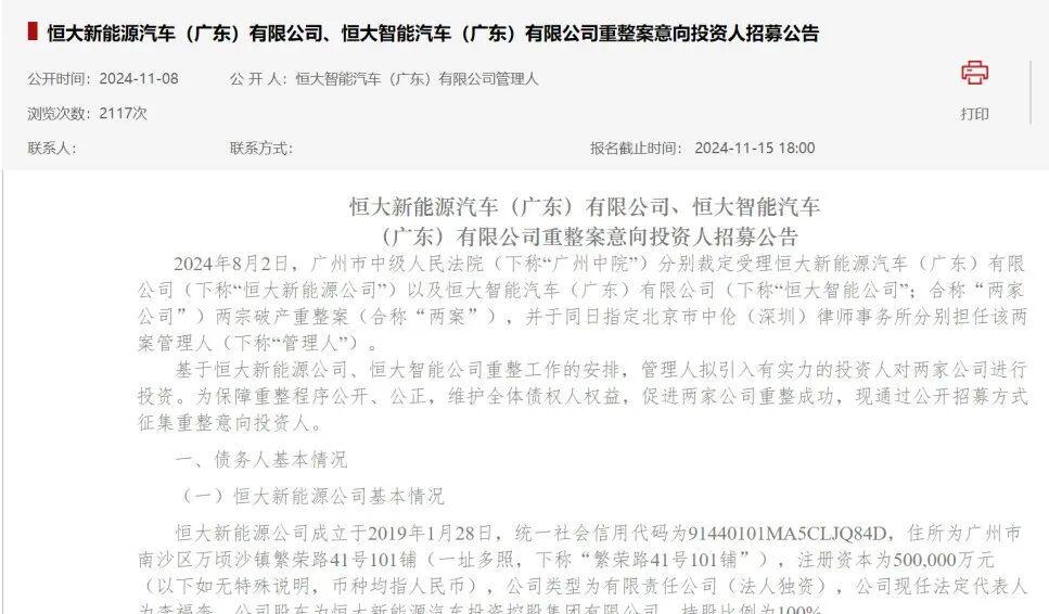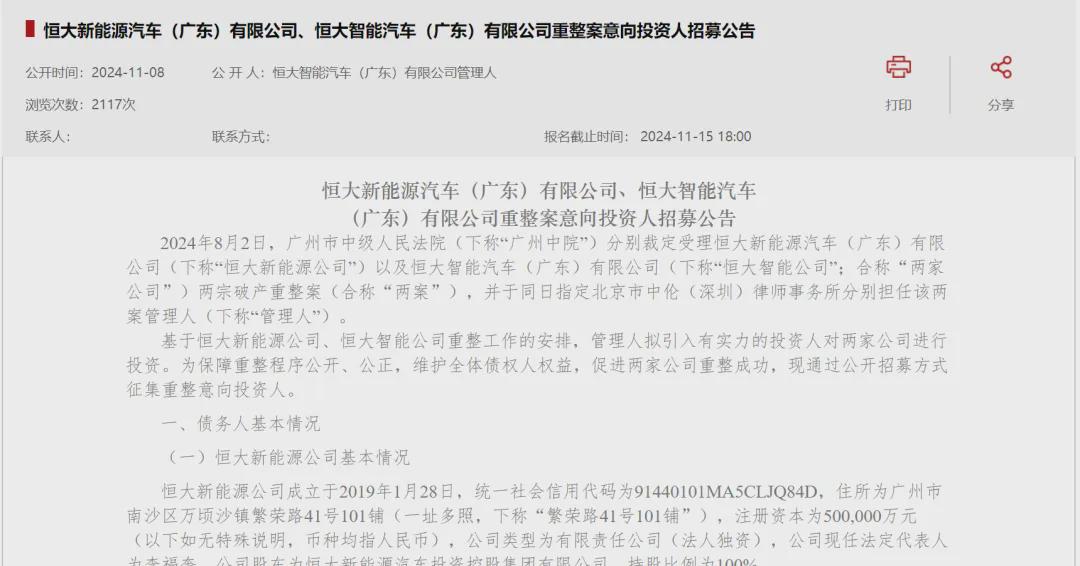 期间,恒大汽车也“努力”过,想通过 招募重整案意向投资人自救。