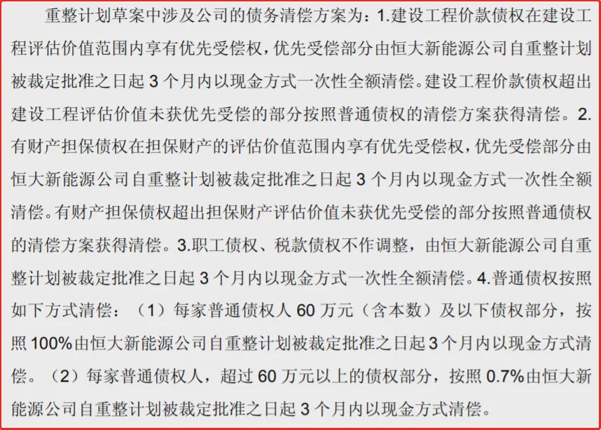 4.普通债权按照如下方式清偿 : ( 1 ) 每家普通债权人60万元 ( 含本数 ) 及以下债权部分 , 3个月内以现金方式100%清偿 。 ( 2 ) 每家普通债权人 ,超过60万元以上的债权部分 , 3个月内按照0.7%以现金方式清偿。