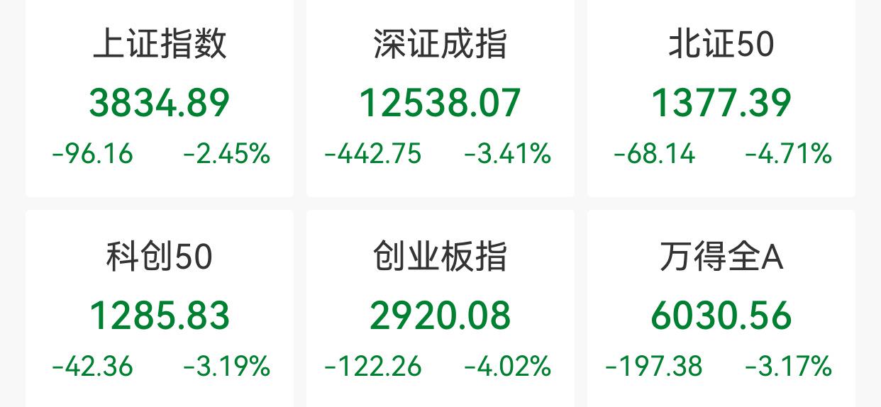 中新经纬11月21日电 21日,A股三大指数低开低走。截至收盘,上证指数跌2.45%,报3834.89点;深证成指跌3.41%,报12538.07点;创业板指跌4.02%,报2920.08点。