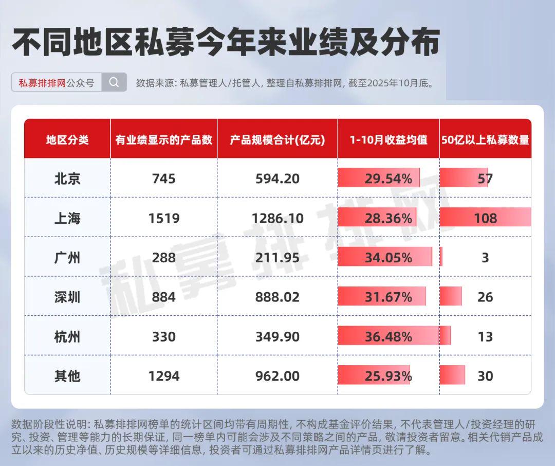 业绩方面来看,根据私募排排网数据,北上广深杭地区的私募产品1-10月收益均值分别为29.54%、28.36%、34.05%、31.67%、36.48%。为了给予更有价值的信息,本文将分别筛选出各地区今年来收益前10私募,供投资者参考。