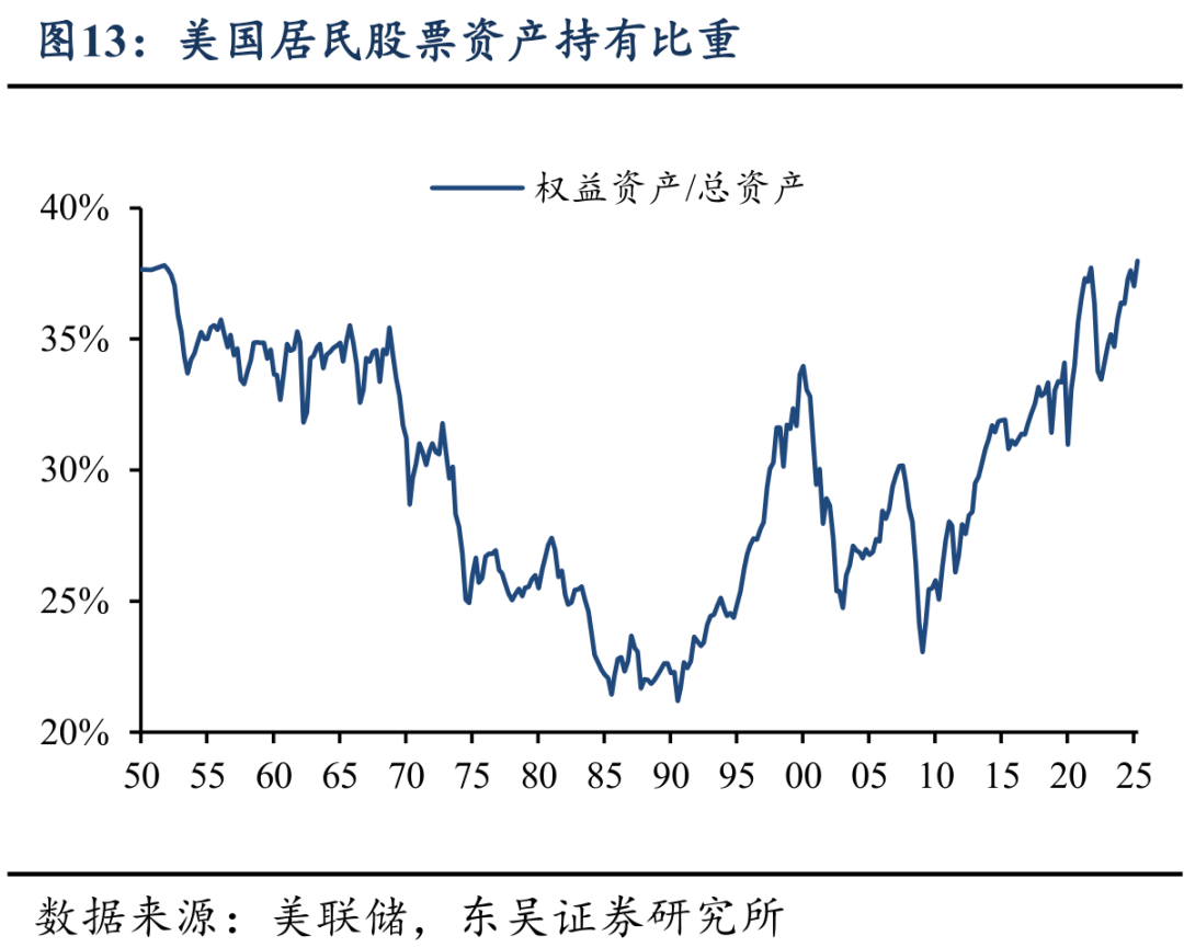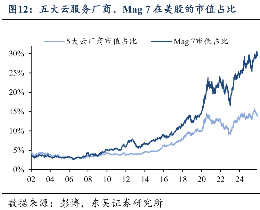 需求端,AI产业浪潮对美股的提振将进一步放大股市对于美国居民的财富效应,替代超额储蓄成为支撑美国消费的重要因素。一方面,在各种计算口径下,疫情以来美国居民的超额储蓄已在2025年耗尽,薪资收入成为支撑居民消费的流量来源;另一方面,2023年以来,AI叙事和产业发展支撑美股以“七巨头(Mag 7)”为首的大型科技企业带动美股连创新高,“美国例外论”也应运而生,与之相对应地,科技巨头在美股中的集中度攀升至历史新高,股票资产在美国居民资产中的占比也升至1950s以来的高位。在一定程度上可以说,AI科技巨头推动了美股持续至今超3年的牛市行情,并通过财富效应成为美国私人消费的重要支撑。向前看,基准情形下我们预计,尽管可能存在阶段性的调整风险,AI叙事下的美股科技巨头在2026年仍有一定的上涨空间,成为美国私人消费稳健增长的增量贡献。