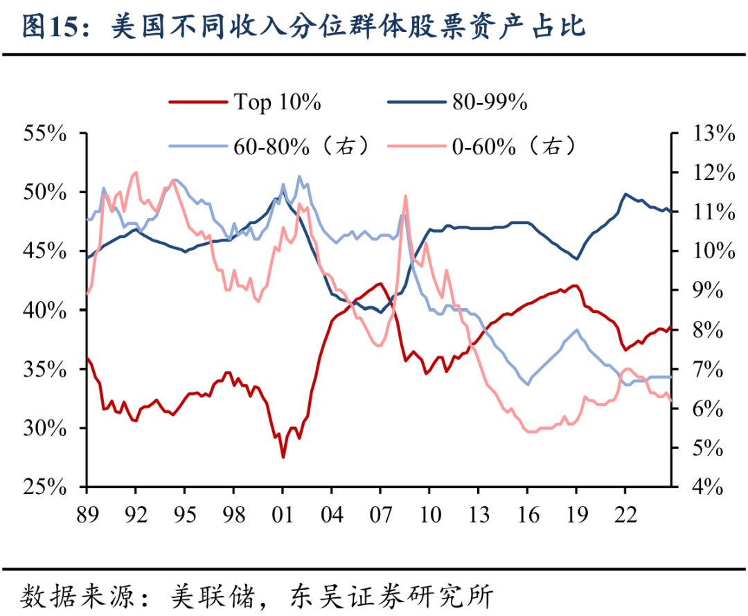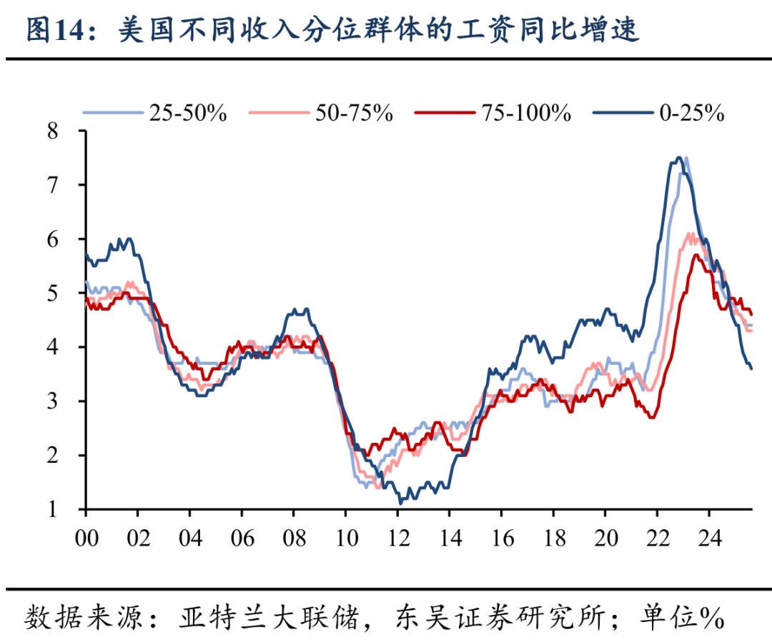 但需要注意的是,这种财富效应支撑下的“K型”消费模式面临增长放缓的压力。具体来看,随着就业市场的降温,今年以来美国中低收入群体的薪资增速已经从前两年的高位显著放缓、并低于中高收入群体;与此同时,股票资产在不同收入分位群体中的分布也存在类似现象:越来越多的股票集中于高收入群体中。这一现象意味着,今年以来美国消费的增长或更多来自于高收入阶层的贡献。表现在数据上,截至最新2025Q3,美国居民信用卡、车贷逾期率维持高位,其中次级贷款者、即中低收入群体违约是车贷飙升的主要因素。因此,向前看,考虑到今年以来美国的存量宽财政延续退坡、美国居民转移收入增长趋于停滞,若缺少增量的财政政策刺激,边际消费倾向更高的中低收入群体将面临更大的收支压力、进而拖累美国消费增长。这也表明2026年特朗普推行增量财政宽松具有客观必要性。
