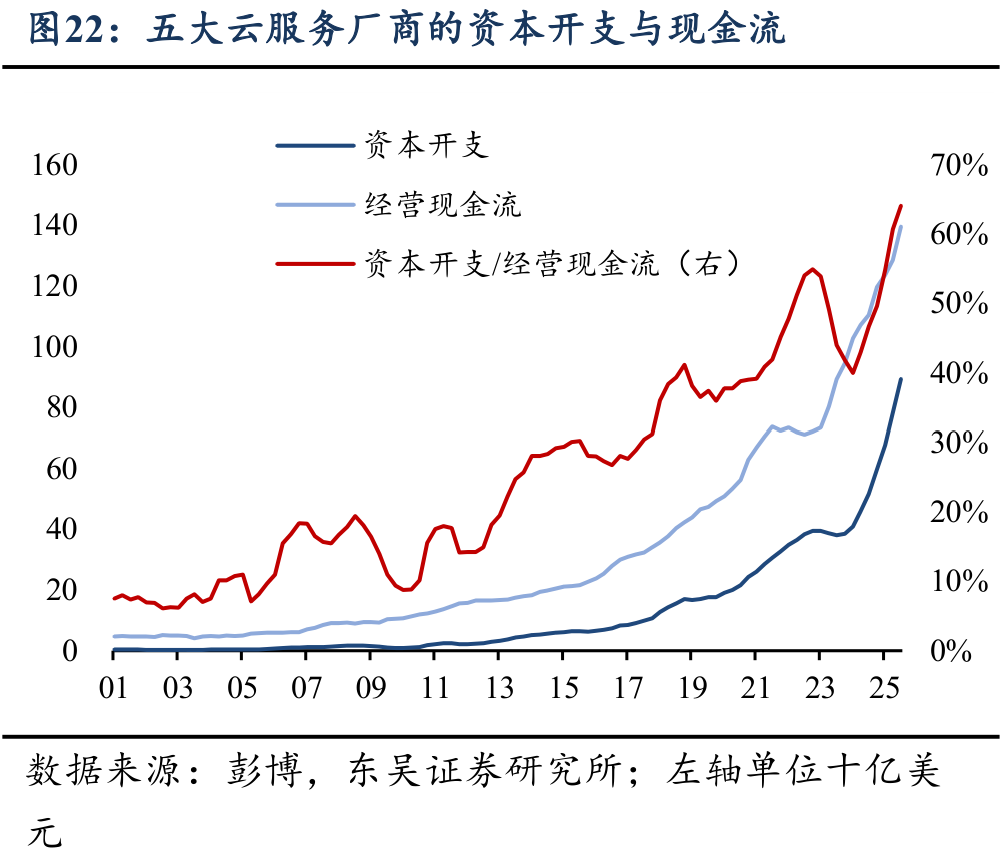 与当前AI引领的技术革命最为接近的案例当属1990s美国的互联网科技浪潮,因而市场也时常担忧同样基于相似软硬件基础的AI产业的迅猛发展,是否最终也将面临泡沫被刺破的风险?但正如Powell在10月FOMC发布会上对美股估值风险的评论,当前的AI产业与1990s科网泡沫最大的区别在于,如今科技巨头的股价上涨有真实的盈利基础,巨额资本开支有充裕的现金流作为支撑,而非严重依赖债务融资,因而发展模式较为健康。