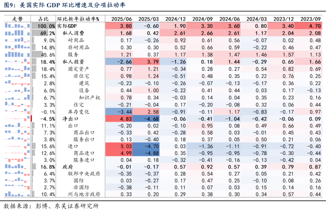 具体来看,我们将美国GDP增速拆分为AI相关投资、消费及其他。其中AI相关投资包括数据中心建筑、计算机及周边设备、软件三项。由于BEA目前只披露了年度的数据中心建设数据,我们参考US Census公布的月度数据中心建设名义值,在GDP口径下进行简单处理,对这一项目的季度数据进行估算。如图10所示,可以发现,尽管占比较小,但环比增速的飙升使得AI相关投资在2025上半年平均拉动美国GDP环比增长1.4%,超越私人消费平均1.05%的水平。在美国消费增速趋于放缓的当下,这对美国增长前景具有重要意义。