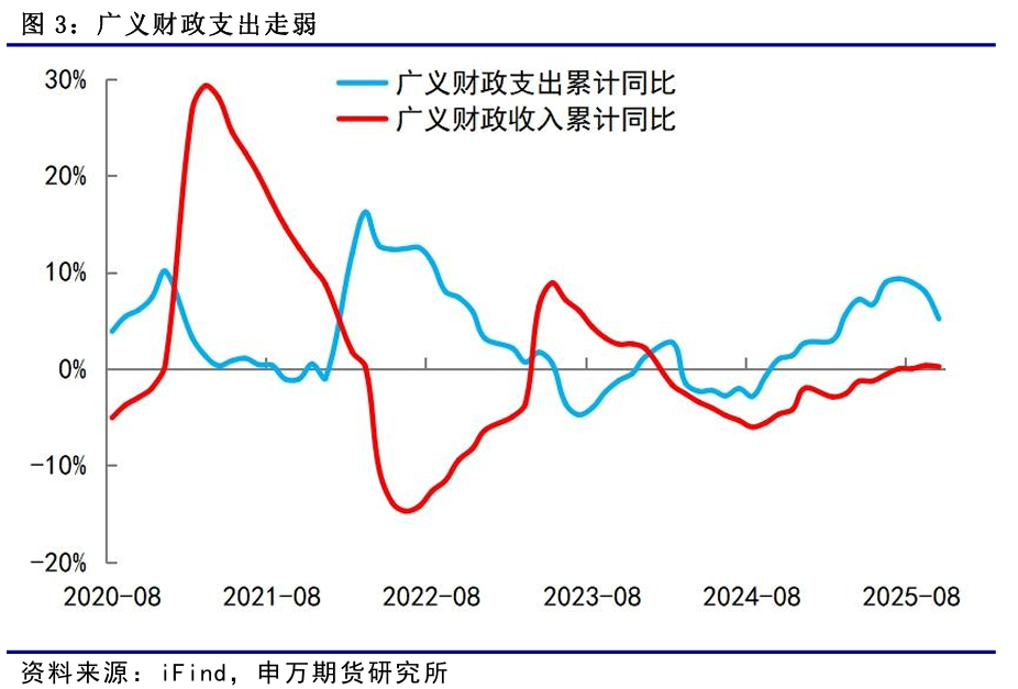 10月财政支出走弱,主要是受到政府债券发行节奏放缓等因素拖累。10月广义财政支出同比下降19.1%,增速较上月下降21.4个百分点。10月一般公用预算支出速度放缓,民生和基建相关支出同比均小幅下滑。政府性基金支出增速大幅下滑,10月全国政府性基金预算支出同比下降38.2%,增速较上月下降38.6个百分点。考虑到当前财政支出进度偏慢,后续财政支出加速可能性上升。随着新型政策性金融工具和中央财政从地方政府债务结存限额中安排5000亿元落地,财政加码将助力四季度经济企稳回升。