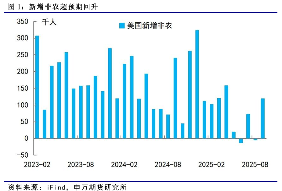 12月降息概率下降。9月非农原定于10月3日公布,但因美国政府停摆而推迟发布。美国劳工统计局表示,将不再单独发布10月非农就业报告,相关就业数据拟合并纳入11月统计。11月非农就业报告定于12月16日发布,较原计划推迟逾一周,且公布时间晚于美联储本年度最后一次货币政策会议,所以无法对12月议息会议提供指引。对通胀风险的担忧以及经济前景的不确定性使得美联储官员近期持续释放鹰派信号,12月降息概率下降。由于在12月议息会议之前缺乏进一步明确的数据指引,美联储在12月暂停加息可能性上升,但即便降息节奏放缓,考虑美国当前“滞胀”的经济形势,美联储仍需要继续降息来呵护经济,因此如果12月暂停降息,1月重启降息概率较大。