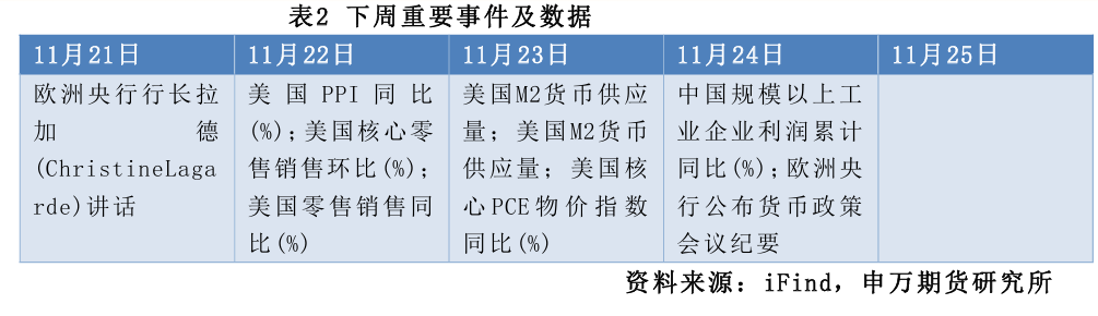 流动性方面,本周央行投放16760亿元,回笼11220亿元,净投放5540亿元。央行公告称,2025年11月21日中国人民银行以固定利率、数量招标方式开展了3750亿元7天期逆回购操作。2025年11月20日中国人民银行以固定利率、数量招标方式开展了3000亿元7天期逆回购操作。2025年11月19日中国人民银行以固定利率、数量招标方式开展了3105亿元7天期逆回购操作。2025年11月18日中国人民银行以固定利率、数量招标方式开展了4075亿元7天期逆回购操作。2025年11月17日中国人民银行以固定利率、数量招标方式开展了2830亿元7天期逆回购操作。
