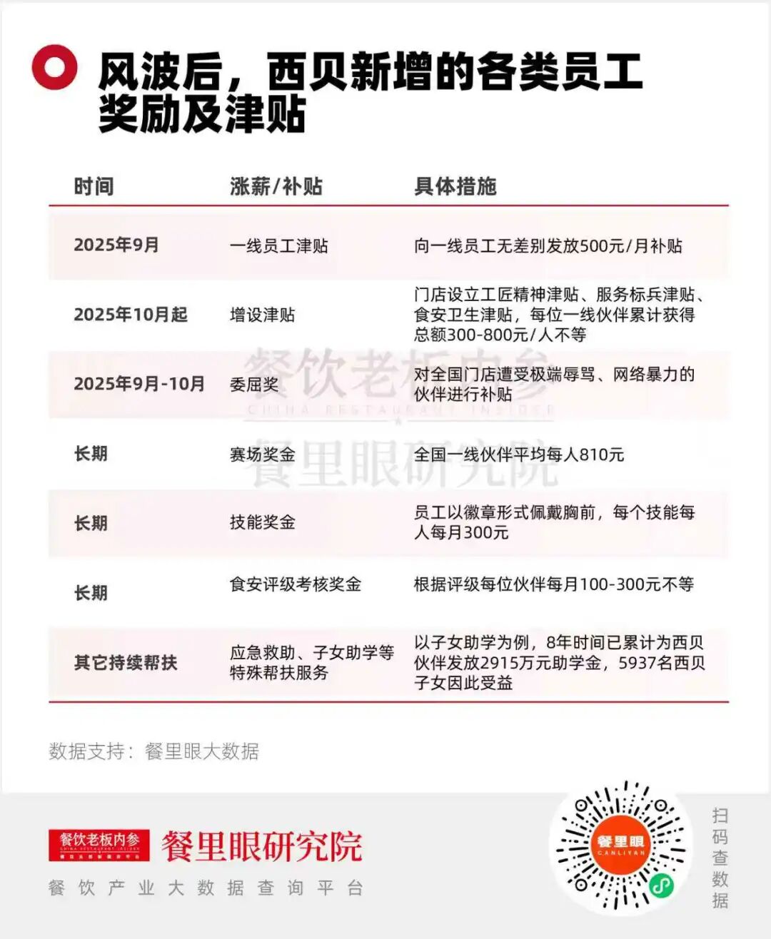 紧接着,西贝开启了一场史无前例的集体涨薪:9月先向店长级以下一线员工发放500元/人/月津贴,10月起增设不同的津贴,一线伙伴累计获得总额300-800元/人不等。同时,新增多项月考核奖金,每月评选“最美西贝人”、“工匠精神奖”、“笑跑答奖”“委屈奖”等,甚至聘请专业的心理辅导团队,通过线上或者到店来辅助员工克服心理障碍。