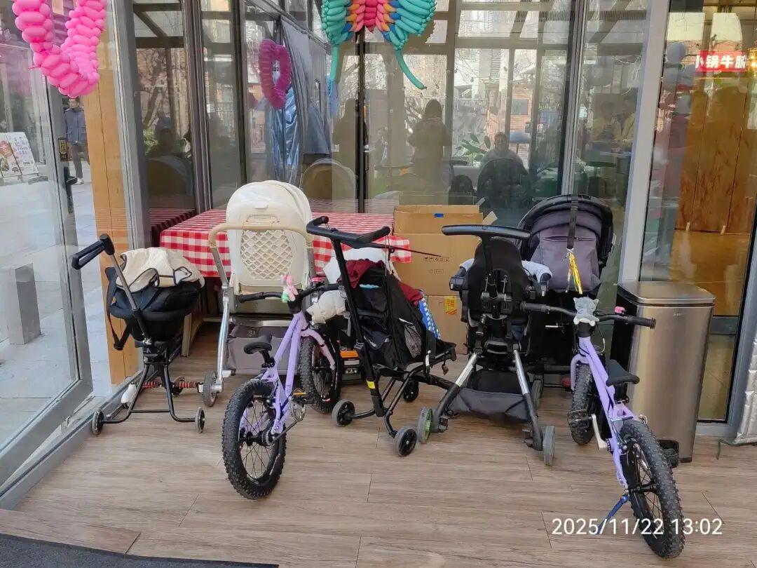 ◎摆放在等位区的各类婴儿推车和自行车 摄图:内参君