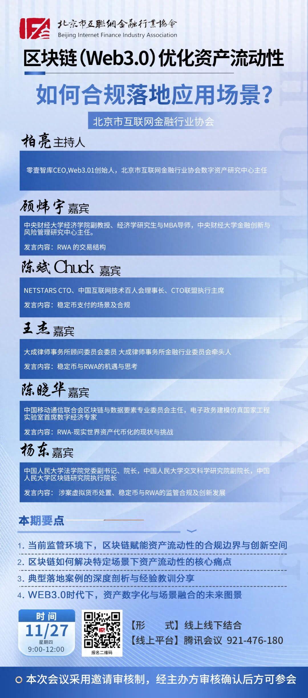 在当前金融业不断探索数字化与合规化并进的时代背景下,区块链(Web3.0)正逐渐成为提升资产流动性的重要技术力量。为促进行业交流、帮助企业准确把握政策边界、探索典型应用场景,北京市互联网金融行业协会将于11月27日(周四)9:00–12:00举办“Web3时代资产场景化与合规研讨会”。