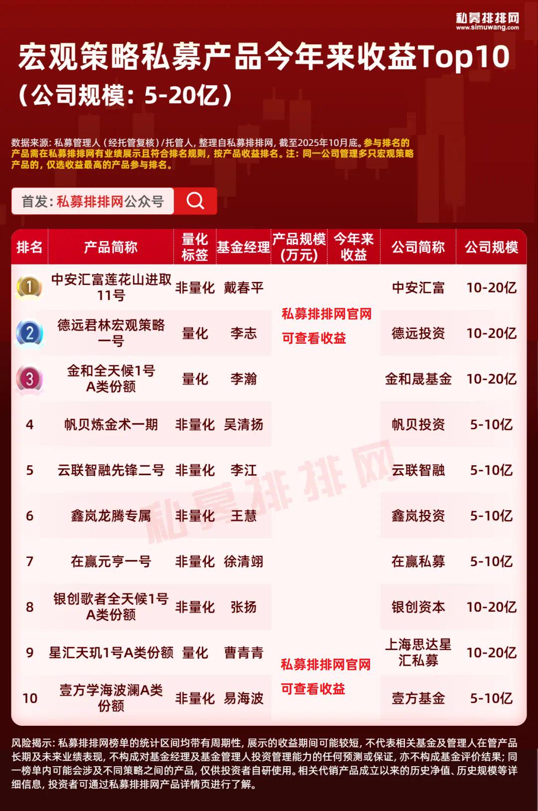 今年前10月收益位居前3的宏观策略产品依次来自:久期投资、银叶投资、远信投资,3家均为百亿私募。