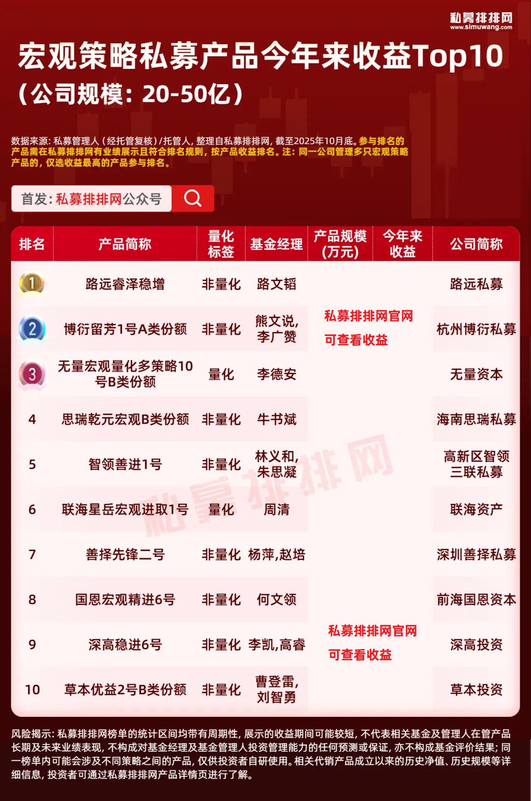 今年前10月收益位居前3的宏观策略产品依次来自:路远私募、杭州博衍私募、无量资本。