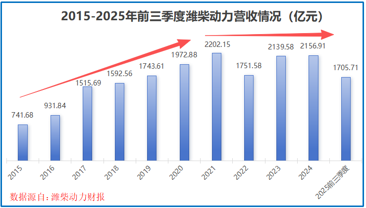 自2021年营收首次突破2200亿元后,潍柴动力的增长便几乎陷入了停滞。2022年营收骤降至1752亿元,尽管2023年、2024年逐步回暖,但始终未能突破2021年的峰值。