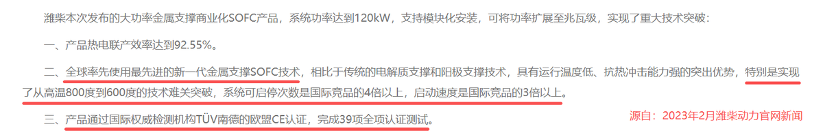 潍柴动力在SOFC上的布局同样有远见,早在2018年便开始入局,历经5年技术攻关实现了SOFC技术的工程化突破。