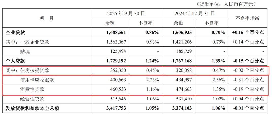其中,信用卡贷款不良率2.25%;消费性贷款不良率1.16%,较上年末下降0.19个百分点;住房按揭贷款0.45%,较上年末下降0.02个百分点。