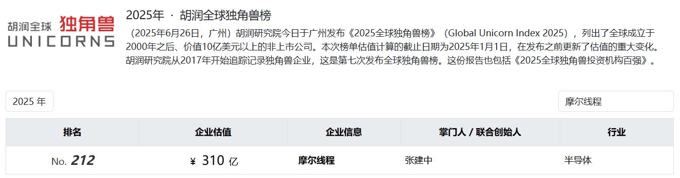 2025年6月26日,摩尔线程以310亿元人民币企业估值位列《2025全球独角兽榜》第212位。