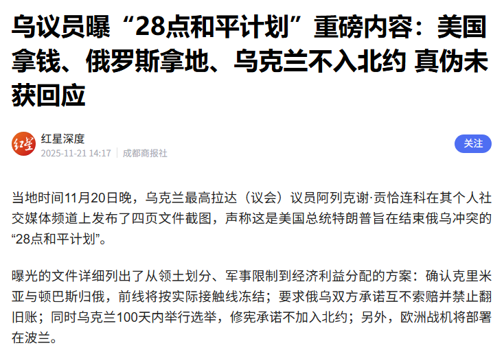 可见所谓的28点计划,恐怕就是为特朗普家族量身定制的,为了在俄乌重建中拿到巨额利益,特朗普彻底抛弃了道义和家国情怀。