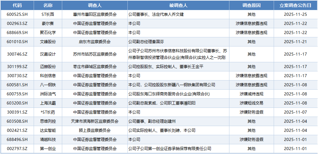 11月以来,A股已有15家上市公司被立案调查,这一数量较10月的7家、9月的12家有明显增加的势头,显示出监管对资本市场违法违规行为的查处力度持续加大。