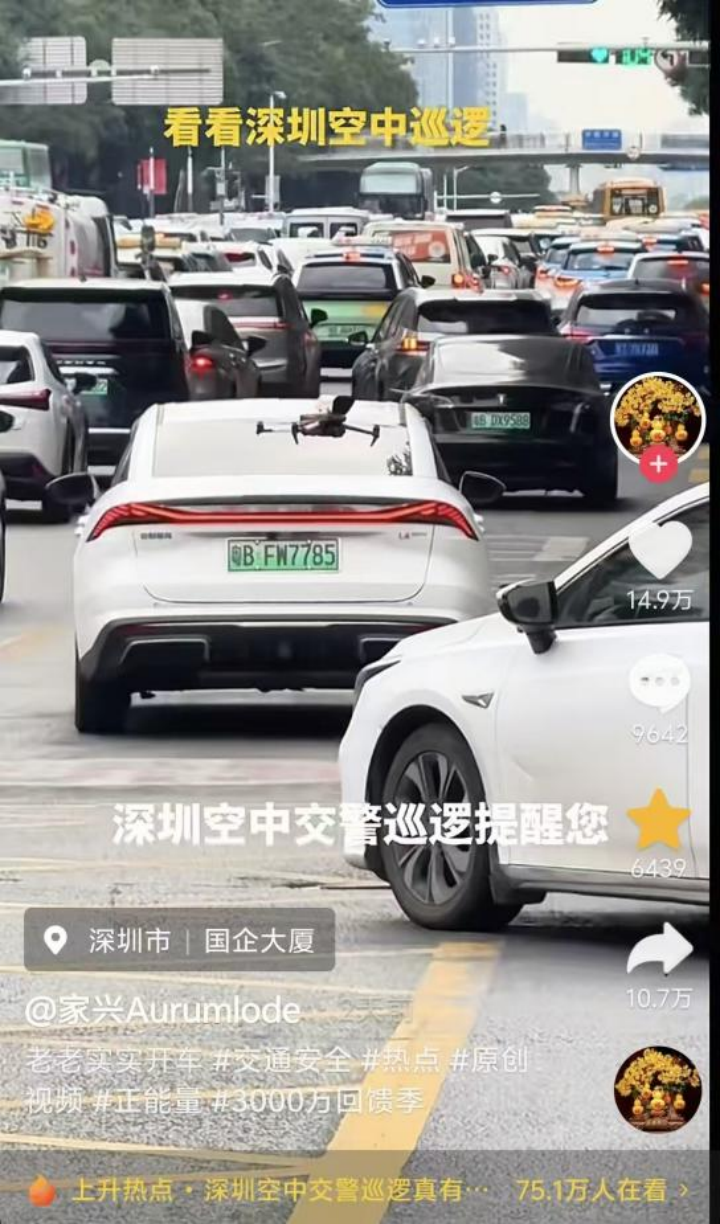 深圳的无人机,上岸第一剑,先斩老司机。最近深圳空中交警用无人机进行巡逻喊话的一段视频在抖音小爆,它在车流中以“磁性男电音”一边播报交通规则一边巡逻喊话“已对您的违法行为记录取证”,“压迫感瞬间就有了”。当有人还在质疑中途没电怎么办,眼尖的网友指出,人家把充电的老窝建在红绿灯杆子上。