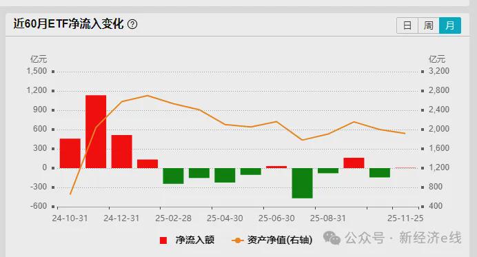 不仅如此,今年来规模指数ETF内部结构分化也十分显现。截至2025年11月24日,仅沪深300一个挂钩ETF指数年内净增规模超过千亿元,达1683.23亿元。不过,由于最近一月大盘震荡,受指数下跌拖累,跟踪沪深300的ETF规模单月累计缩水超500亿元。