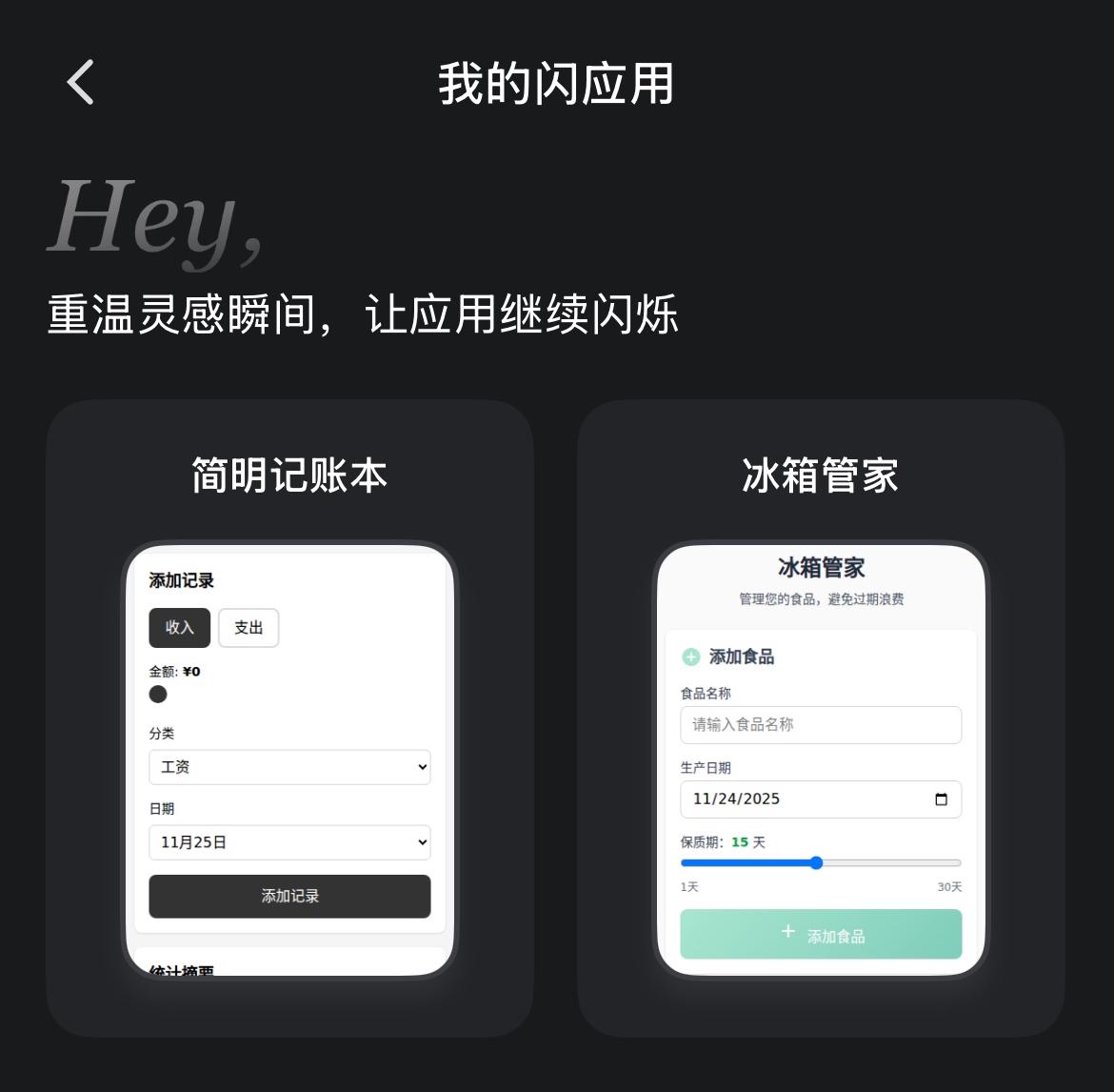 “很惊喜,它的生成效率非常高,基本上我发出第一段指令,生成的内容就能实现我绝大部分想法。”小谢(化名)对红星资本局感慨道,仅数天时间,她已经在“闪应用”中生成了四个小程序,分别用于睡眠打卡、记账、英语听力训练和提供菜谱灵感。