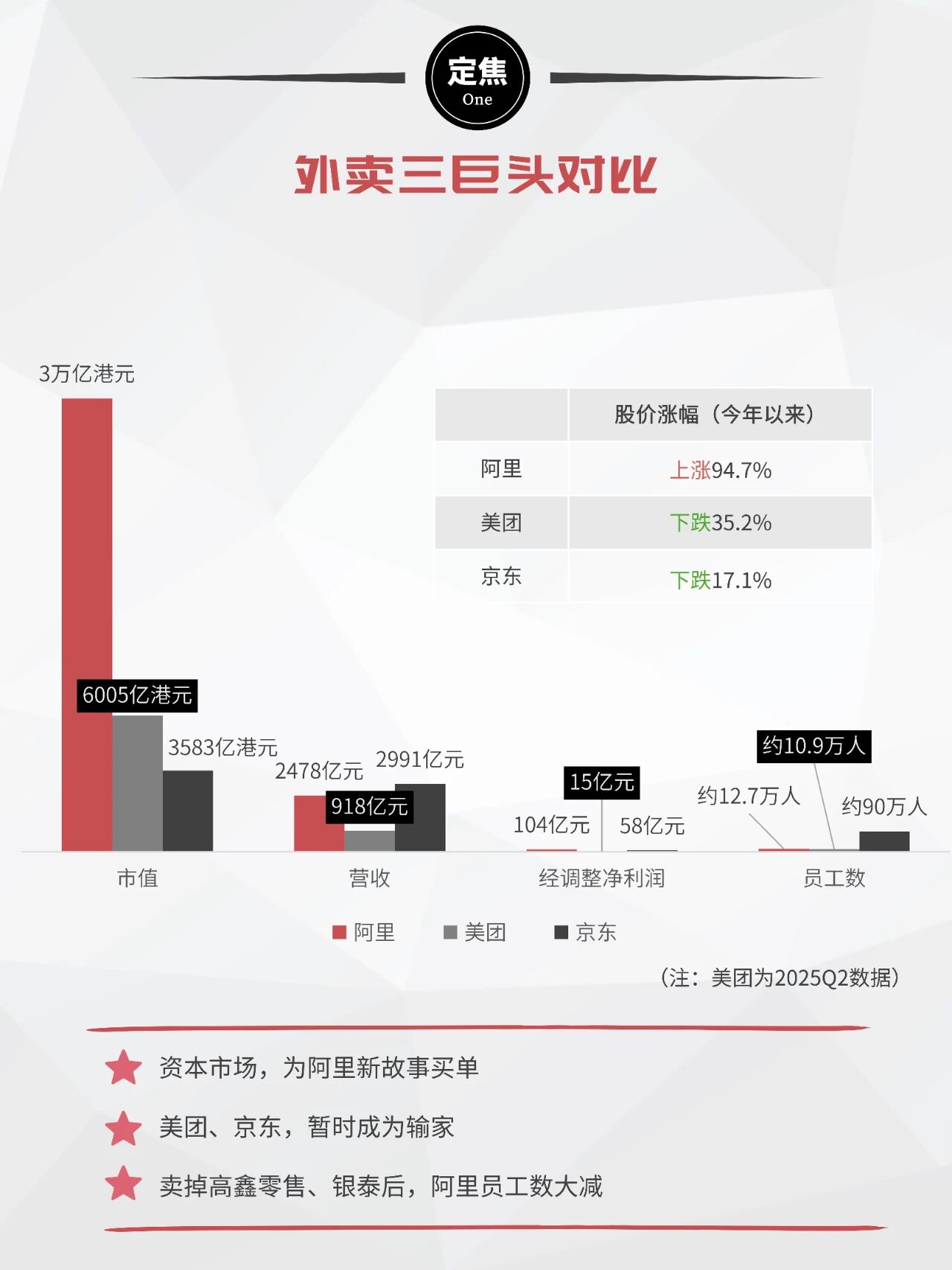 从二季度到三季度,这场外卖大战格局已经出现分化,阿里市值3万亿港元,年内股价涨94.7%,资本市场为其 “外卖+AI” 新故事买单;而美团、京东市值分别为6005亿港元、3583亿港元,年内股价均为下跌。
