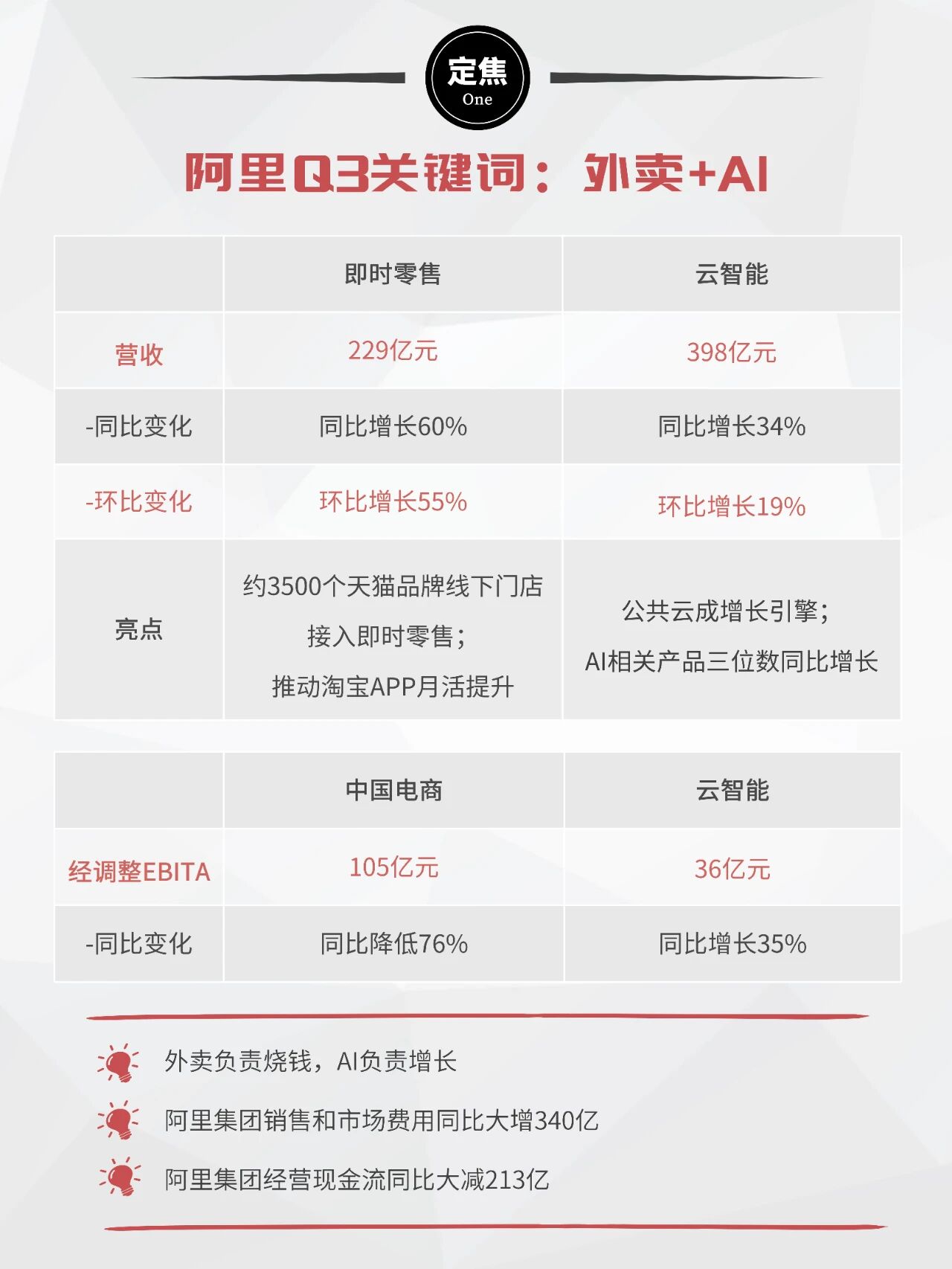 一面是即时零售的重金投入,一面是云智能的高增托底,外卖和AI成为阿里三季度的两个关键词: