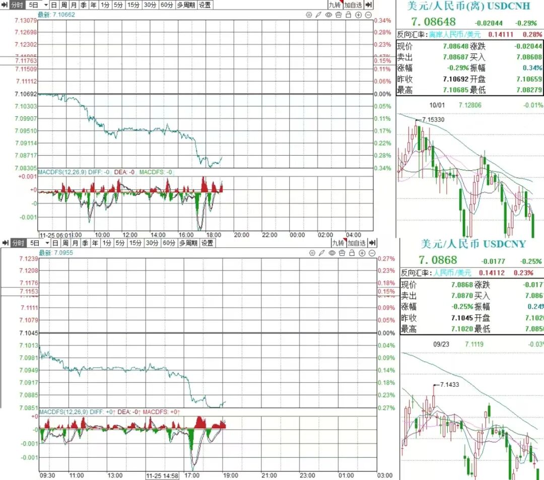 11月25日,人民币汇率刷新逾1年来高位,在岸、离岸人民币对美元汇率双双收复7.09关口。