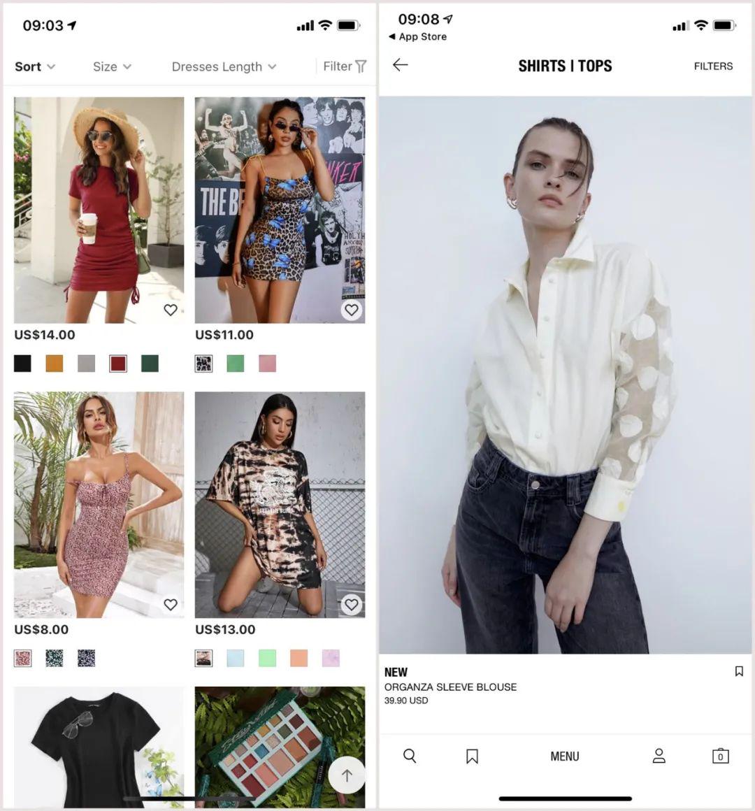 SheIn(左)和 Zara(右)应用截图