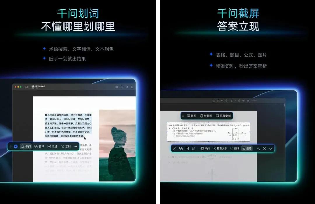千问悬浮球、千问划词和千问截屏等六大“千问智能套件”,贯穿于搜索、阅读、文档撰写、文件处理等高频场景中。