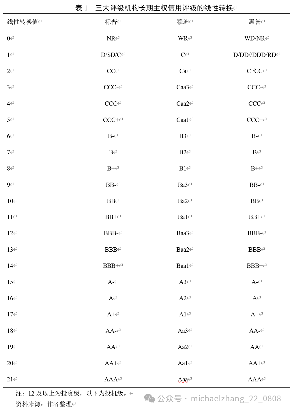 标普、穆迪和惠誉的主权信用评级是发行人评级的一种形式,具有相似的主权信用评级体系,都可分为长期和短期、本币和外币、投资级和投机级,但具体的划分依据和设定的评级符号不完全相同。长期发行人信用评级关注的是债务人在长期内履行其所有财务承诺(包括长期和短期)的能力和意愿,按评级等级高低各有21、21和23个级别。为方便分析比较,本文参考Reusens and Croux(2017)和De Moor et al.(2018),将三大评级机构的长期主权评级结果由定性要素转换为定量数值,从而构建主权信用评级指标。方法是从最低评级到最高评级,依次从小到大线性转换为0-21的数值。如表1所示。其中,12及以上为投资级,以下为投机级。短期发行人信用评级关注的是债务人在短期内履行其所有财务承诺的能力和意愿,标普可以分为共A-1+、A-1、A-2、A-3、B、C以及SD和D共7个级别;穆迪有P-1、P-2、P-3以及NP共4个级别;而惠誉有F1+、F1、F2、F3、B、C、RD以及D共8个级别。