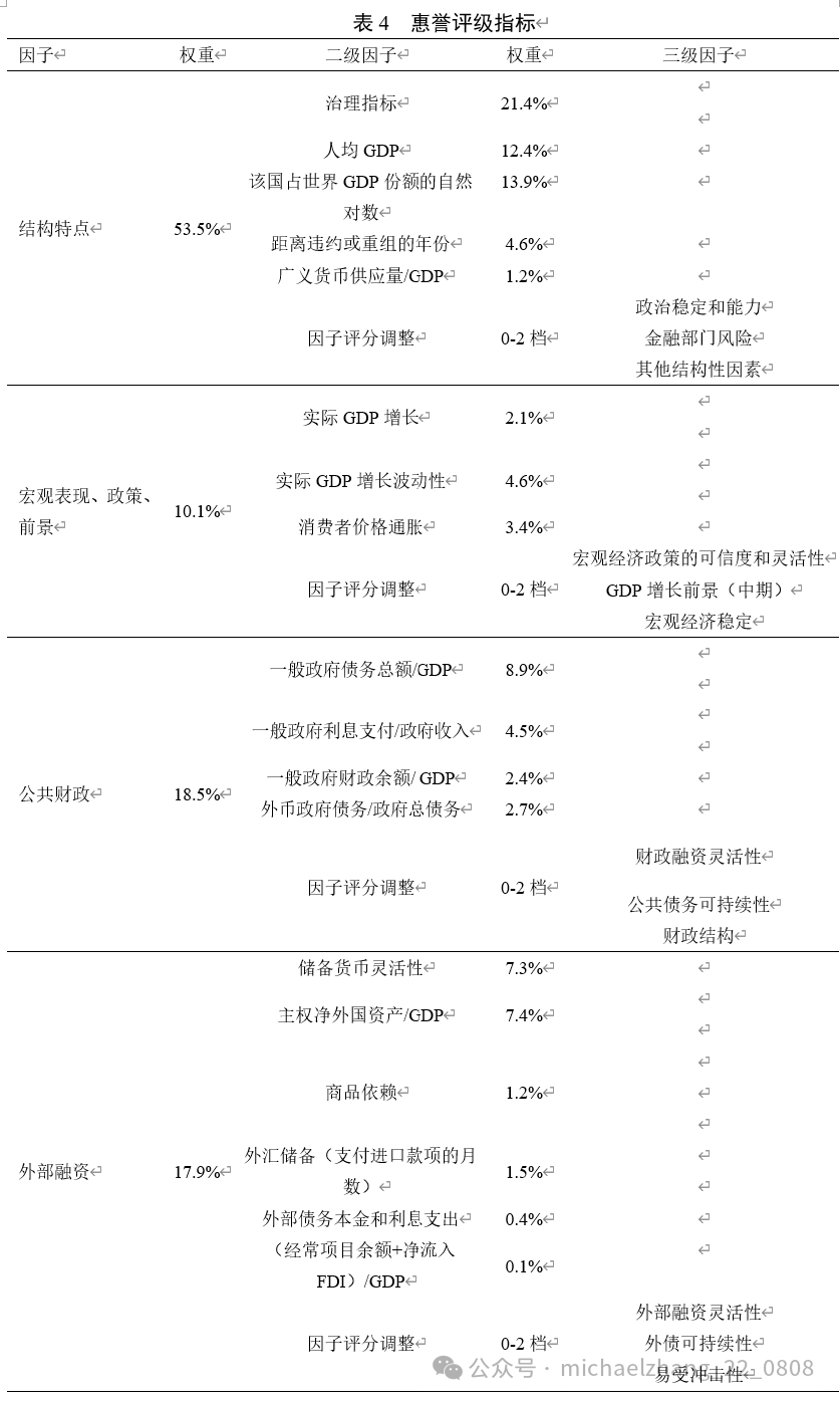 惠誉综合使用了其主权评级模型(SRM)和定性覆盖(QO)进行主权信用评级(表4)。首先,惠誉采用其SRM作为主权评级的起点,根据定量变量确定评级初步评级。其次,惠誉采用QO的定性因素来调整SRM中未反映或未完全反映的因素,每个因子的调整范围为-2到+2,总体的调节范围为-3到+3。最后,结合SRM和QO的评分,综合得到主权信用评级。