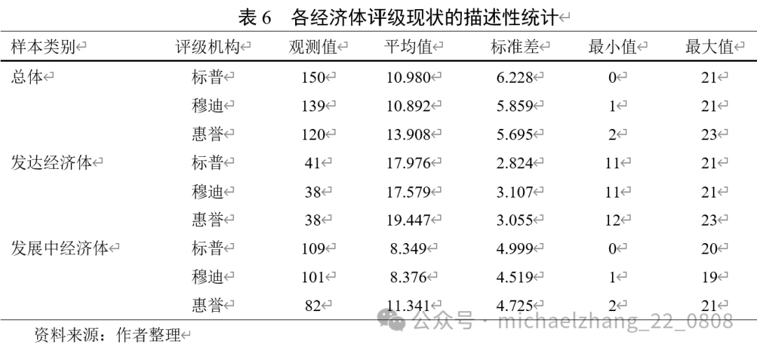 此外,评级机构之间存在评级分化现象,这可能是由于它们在评级时考虑的指标权重不同,或者是因为它们对同一指标的解读存在差异。当不同评级机构同时对同一发行人给予不同的信用评级时,就会出现评级分化。这种分化可能是暂时的,也可能会变得持久。主权信用评级的分化现象在不同经济发展水平的经济体中都很明显(Vu et al.,2017)。