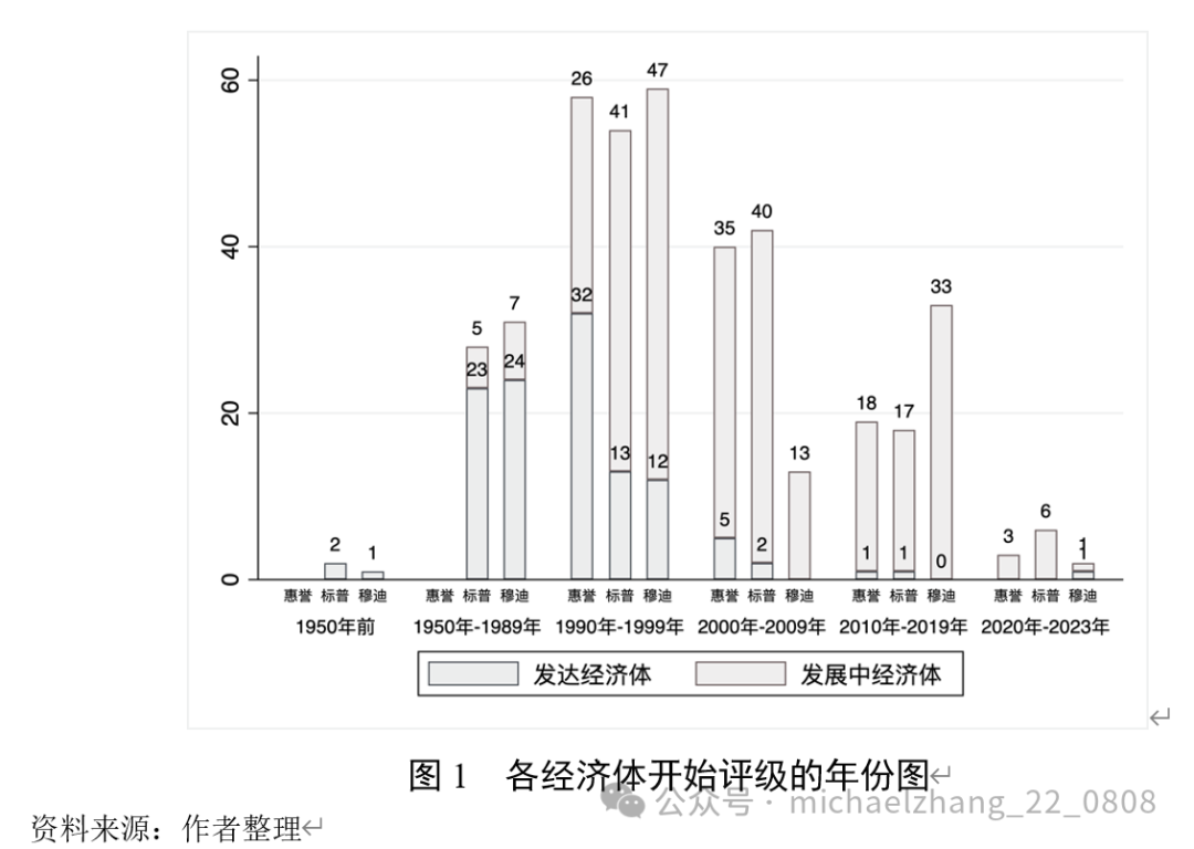 中国的主权信用评级开始于20世纪90年代前后,与大部分发展中经济体的评级开始时间相似,但晚于发达经济体。历史上,标普和穆迪开始评级的时间比惠誉早(标普比穆迪也稍早些),评级的经济体也更多,且三大评级机构对发达经济体的评级行动早于发展中经济体(图1)。标普从1941年开始对经济体进行主权信用评级,1月1日赋予美国AAA级。穆迪1949年第一次评级,于2月5日赋予美国Aaa级。惠誉1994年开始评级行动,8月10日同时对美国、西班牙等24个经济体进行长期外币主权信用评级。此外,标普和穆迪在1990年以前多为欧美经济体评级,参与评级的亚洲经济体较少,仅有日本、马来西亚、新加坡、泰国、韩国、中国香港和中国台湾。金融开放和全球经济一体化的发展使得更多发展中经济体需要通过接受主权信用评级进入国际金融市场,1990年之后越来越多的发展中经济体开始接受主权信用评级。标普、穆迪和惠誉对中国的首次主权信用评级分别为1992年2月20日、1988年5月18日和1997年12月11日,与其他发展中经济体的评级开始时间相似,晚于发达经济体。