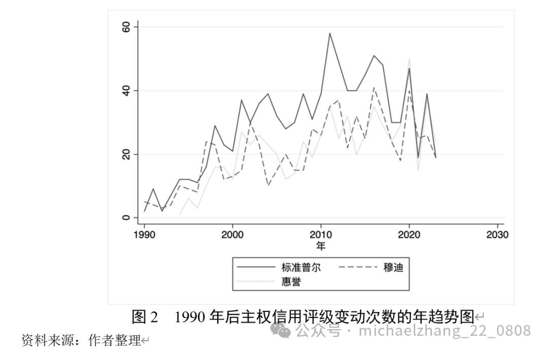 二是全面分析中国主权信用评级的历史演进,并结合评级面临的优劣势对中国未来主权信用评级变动做出预期。当前国际经济和政治局势纷繁复杂,中美展开贸易和金融博弈,中国需以史为鉴,明确优劣势所在,多措并举预防主权信用评级被继续调降。已有关于特征事实的研究多针对评级机构的某一次评级行动(王瑶和张明,2025;王瑶,2025)或某段特定时期的变化做出具体分析(林峰和邓可斌,2020;陈奉先和贾丽丹,2021;Tran et al.,2021;Vu et al.2022),未基于中国全面的历史评级数据进行分析,也未与其他经济体的评级变动情况进行对比分析,无法总结中国评级变动的特点及背后的共性原因。本文使用标普、穆迪和惠誉全面的主权信用评级历史数据,在与总体经济体的评级变动情况进行对比的基础上,详细分析中国主权信用评级变动的五个特点,从而理解中国评级的变动情况,具体分析评级面临的优劣势,以预期未来评级变动可能性,更好应对国际评级机构对中国主权信用评级的调整,并为维持中国高评级进行提前部署。