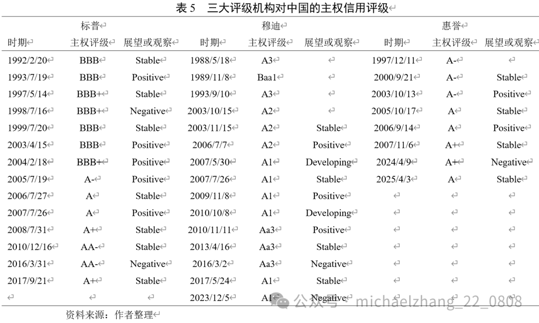 综上所述,中国的主权信用评级变动不仅反映了中国经济的稳健增长和国际信用的提升,也体现了评级机构对中国经济基本面和政策变化的敏感性和审慎性。同时,评级机构之间的异质性和评级分化现象也提醒我们,在评估国家信用状况时,需综合考虑多个评级机构的观点和分析。
