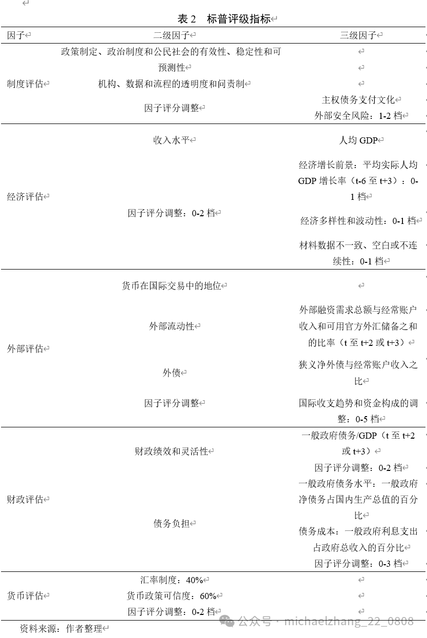 标普的主权评级标准纳入了其认为影响主权政府按时足额履行其对非官方债权人的金融义务的意愿和能力的因素,主要基于五大支柱,分别为制度评估、经济评估、外部评估、财政评估和货币评估,包括一系列定量因素和定性考虑因素。这五个因素中的每一个都以6分制进行评估,从“1”(最强)到“6”(最弱)。根据标准,制度和经济评估结合起来形成主权国家的“制度和经济概况”,外部、财政和货币评估结合起来形成其“灵活性和绩效概况”。在考虑了补充调整因素以及趋势和标准定义的其他因素后,将这两种情况综合起来确定主权外币评级(表2)。