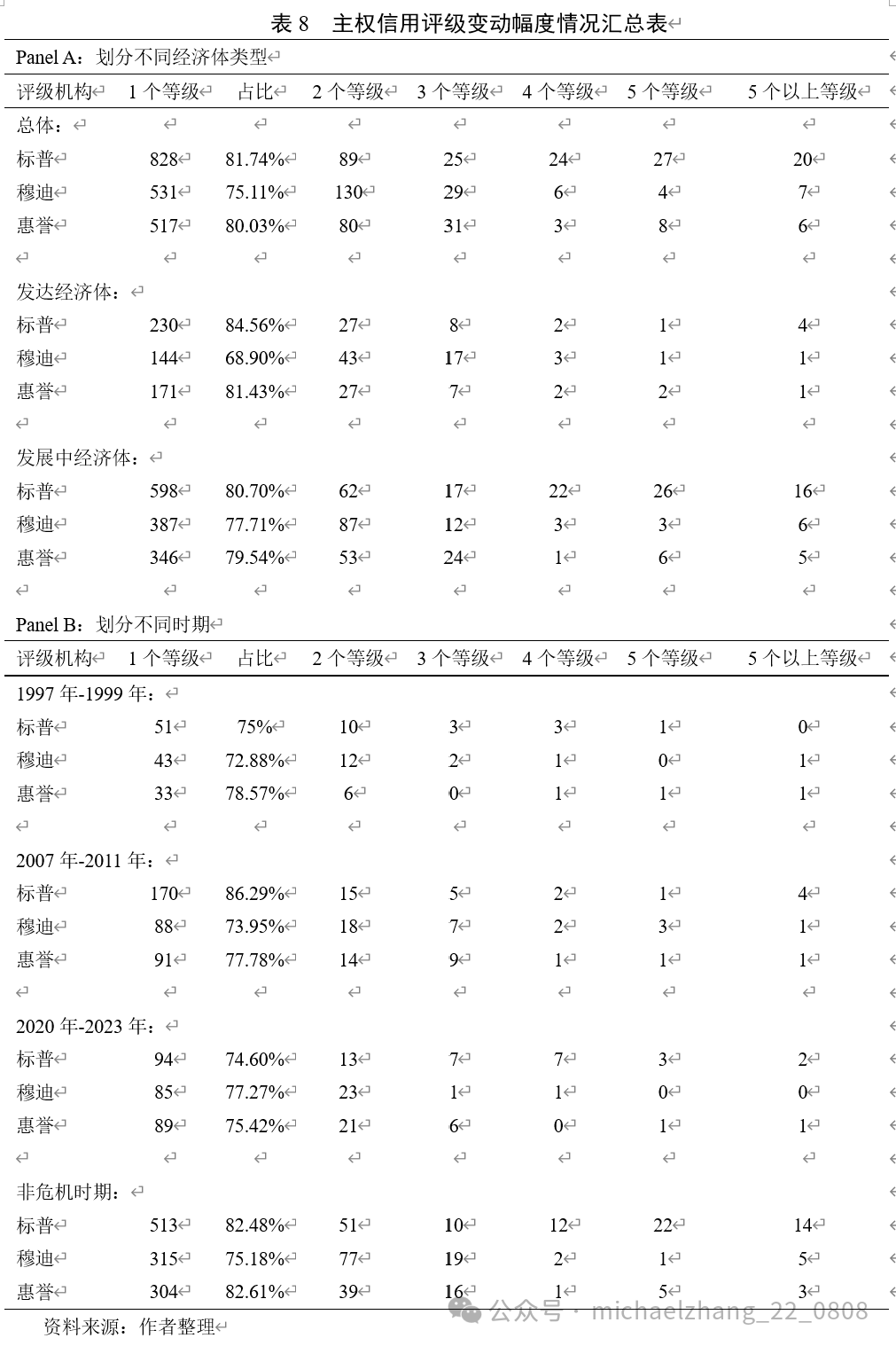 其四,与其他经济体的评级变动相似,通常情况下,中国的主权信用评级每次变动一个等级。从表8可以看出,不论是何种类型的经济体,不论处于何种时期,三大评级机构每次变动一个等级的占比最大,均为70%以上。区分不同经济体类型和不同时期,发展中经济体和危机时期的评级评级变动一个等级的数量占比略低。此外,总体来看,评级变动幅度较大的数据多出现于危机时期(如2010年、2011年、2021年和2022年),且评级下调居多。