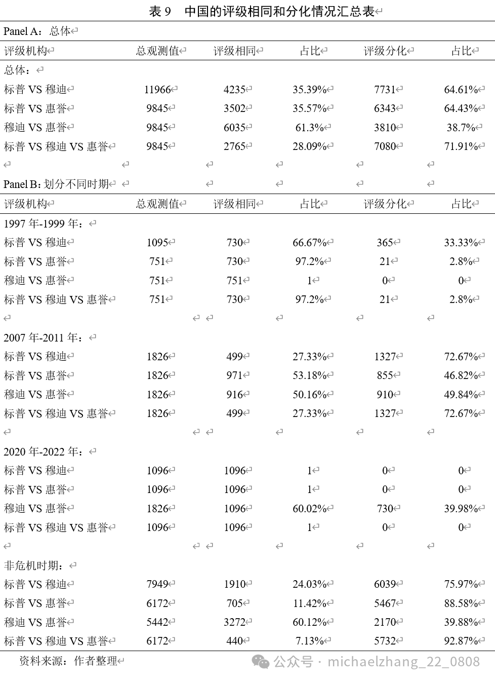 对中国的样本数据进行补零操作后,可以分析三大评级机构对中国的评级相同和评级分化行为。定义评级相同为两个或三个评级机构对中国在同一时期的主权信用评级水平相同,则评级分化则为同一情况下的评级水平不相同。得到以下结论(表9):第一,总体来看,三大评级机构之间的两两评级相同行为比三个评级同时相同行为的占比大,且相较于其他情形,穆迪和惠誉之间的评级相同占比最大,在60%左右;第二,比较不同时期,2007年-2011年的评级分化现象最多,2020年后的评级分化现象较少,说明三大评级机构的评级越来越趋同。