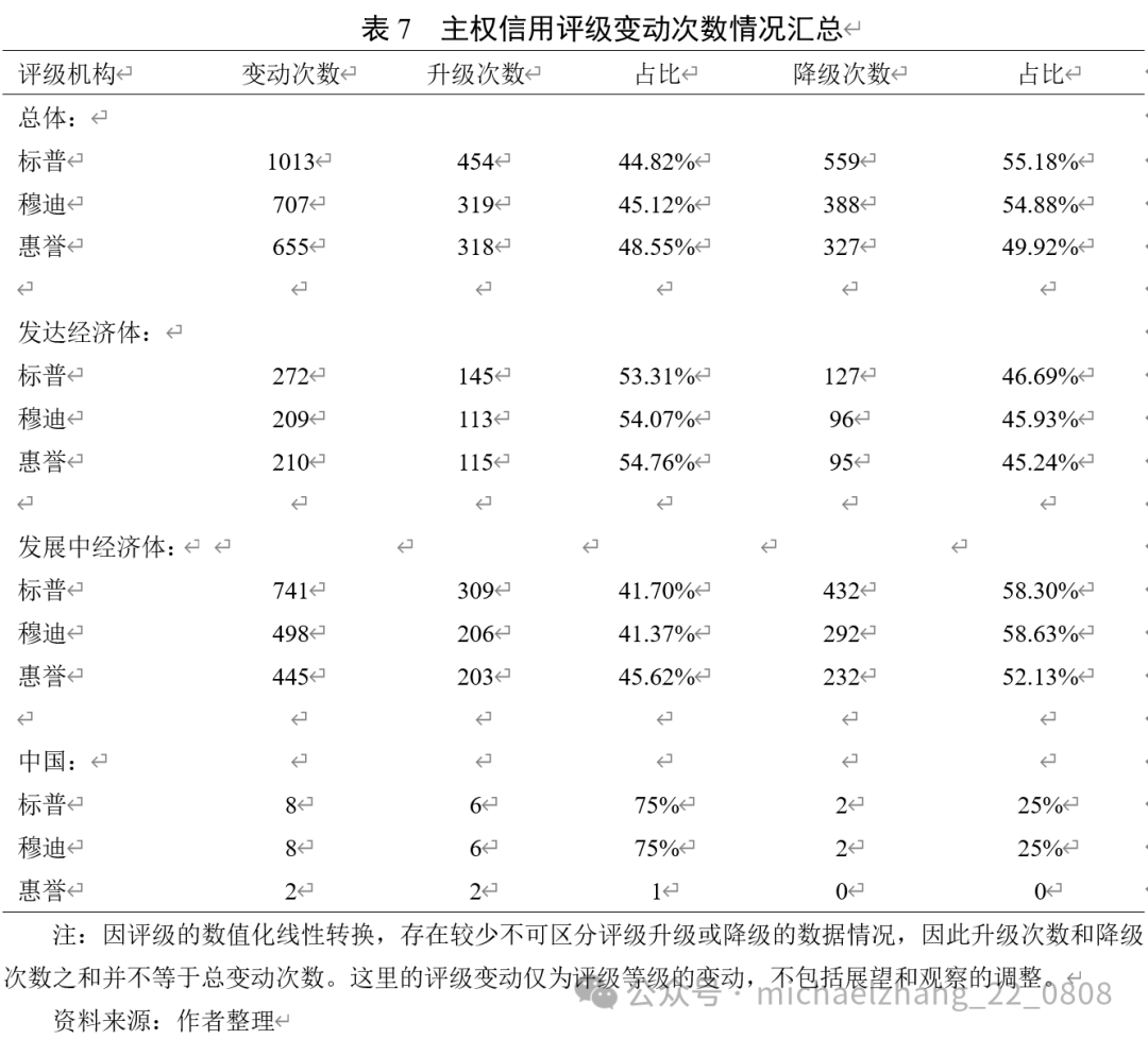 中国的主权信用评级变动,作为衡量中国政府信用状况和经济健康度的重要指标,呈现出5个显著的特点。其一,尽管在不同时期经历了一些波动,但从长期视角来看,中国的主权信用评级整体上呈现出稳定提升的趋势。这一趋势不仅使中国的主权信用评级始终保持在投资级评级的范畴内,而且反映了中国经济的持续增长和国际信用的逐步增强。与中国不同的是,从全球视角看,国际评级机构的评级一定程度上偏好发达经济体。一方面,就评级变动的经济体数量而言,发达经济体中升级的数量大于降级,发展中经济体则相反,尤其是2010年之后。另一方面,就评级变动的次数而言,总体来说降级次数多于升级,但发达经济体的升级多于降级(表7)。