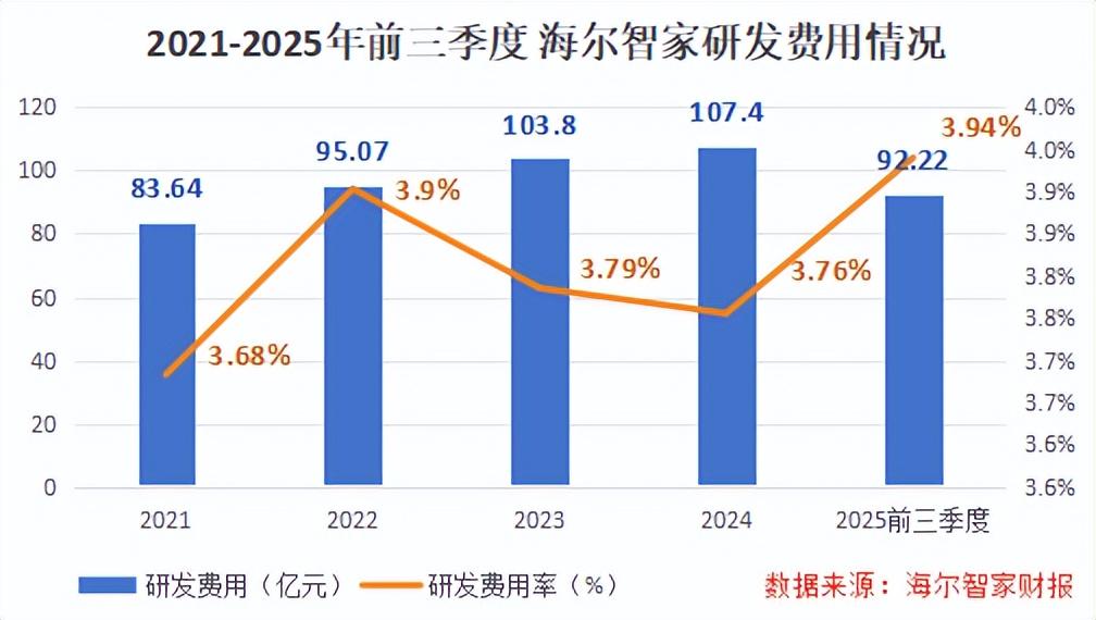 虽然销售费用率在下降,但海尔的研发费用率却呈上升趋势。2025年前三季度,公司研发费用率甚至高达3.94%。